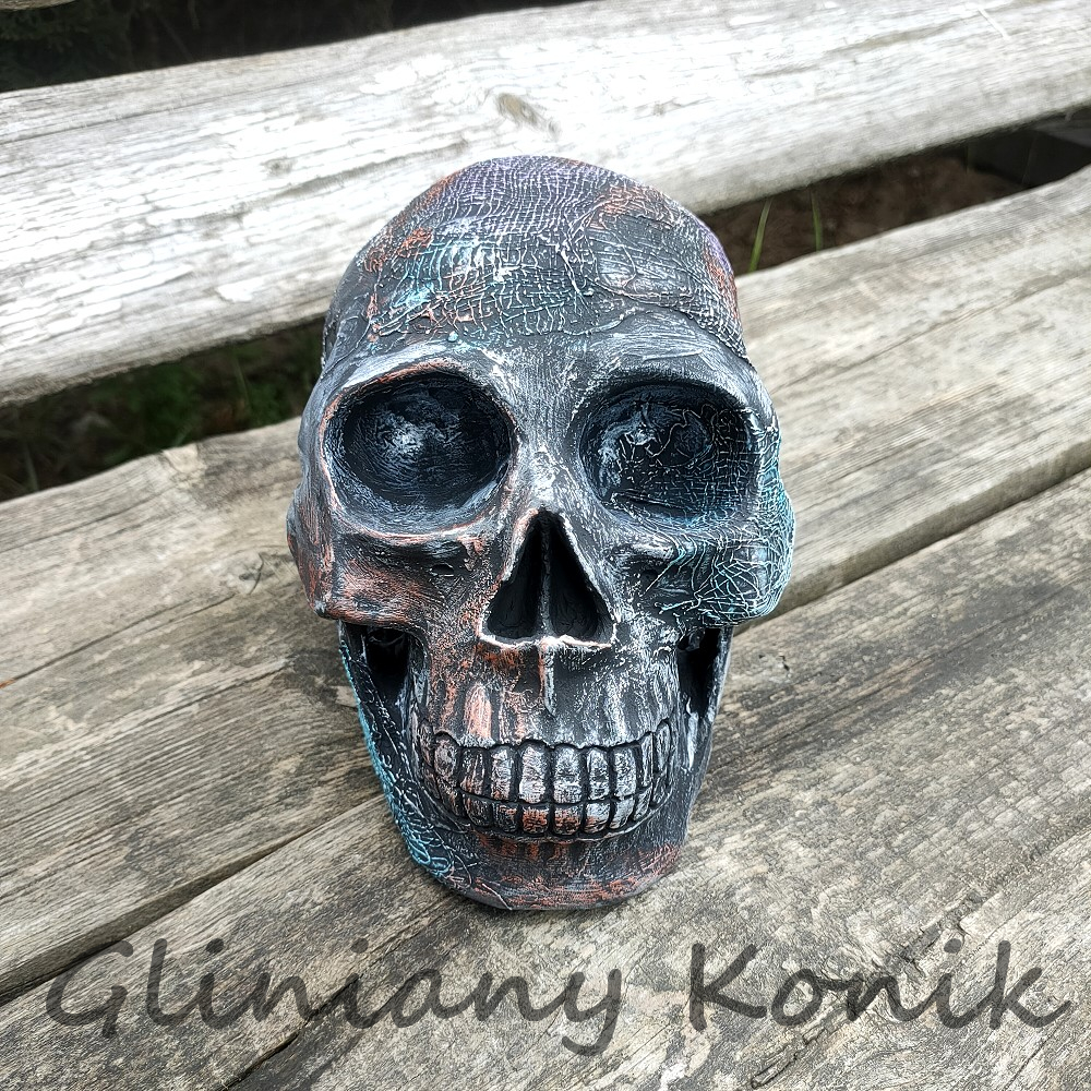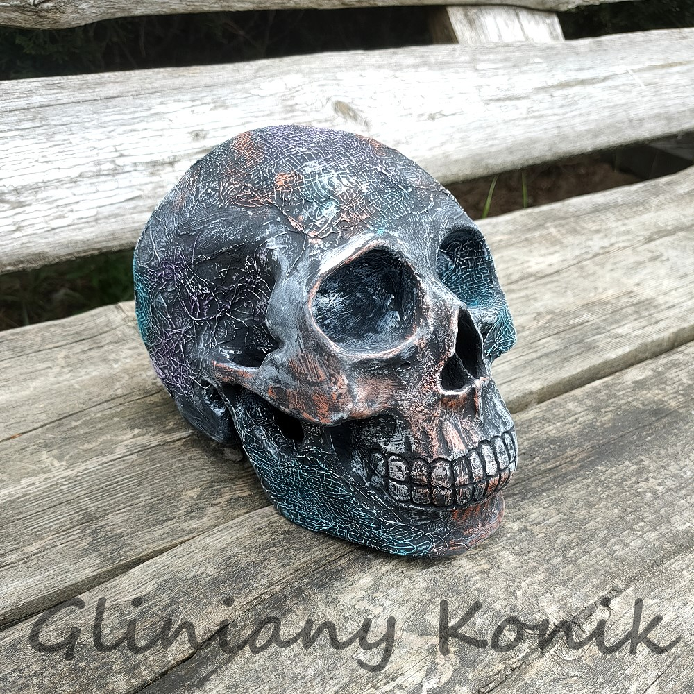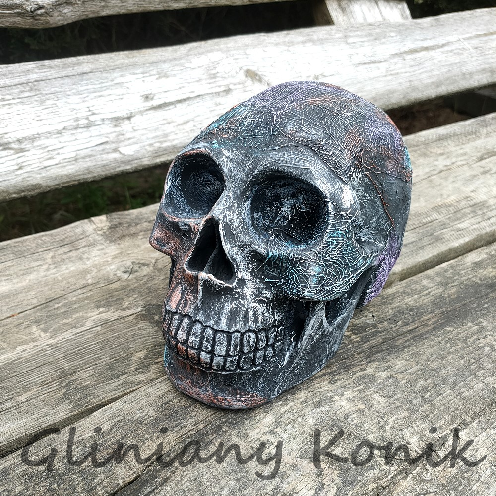 Ręcznie rzeźbiona w glinie czaszka ozdobiona metodą mixed media to fascynujący projekt artystyczny, który łączy różne techniki i materiały. Czaszka, będąca centralnym elementem dzieła, została starannie uformowana z gliny, co nadaje jej organiczny, naturalny kształt. Ozdobienie różnymi fakturami i kolorami nadaje jej tajemniczości i charakteru.