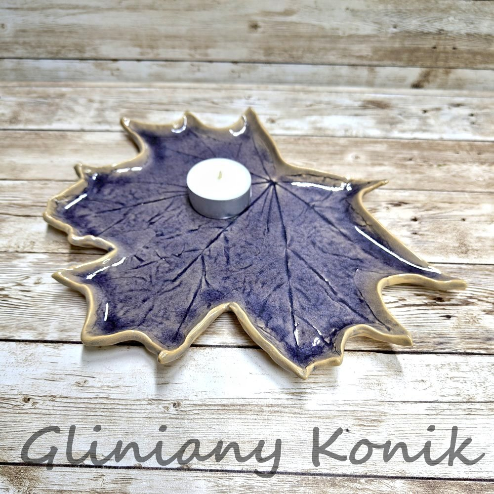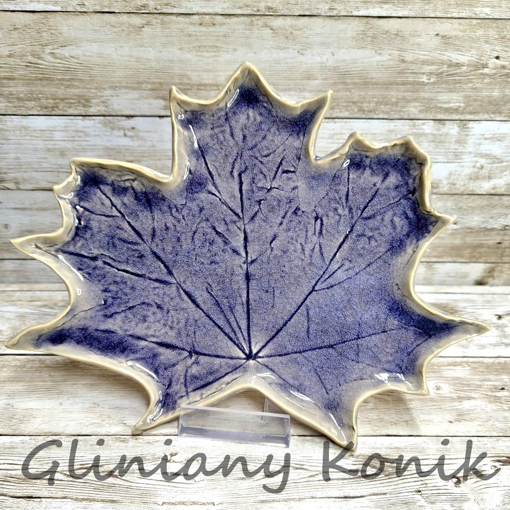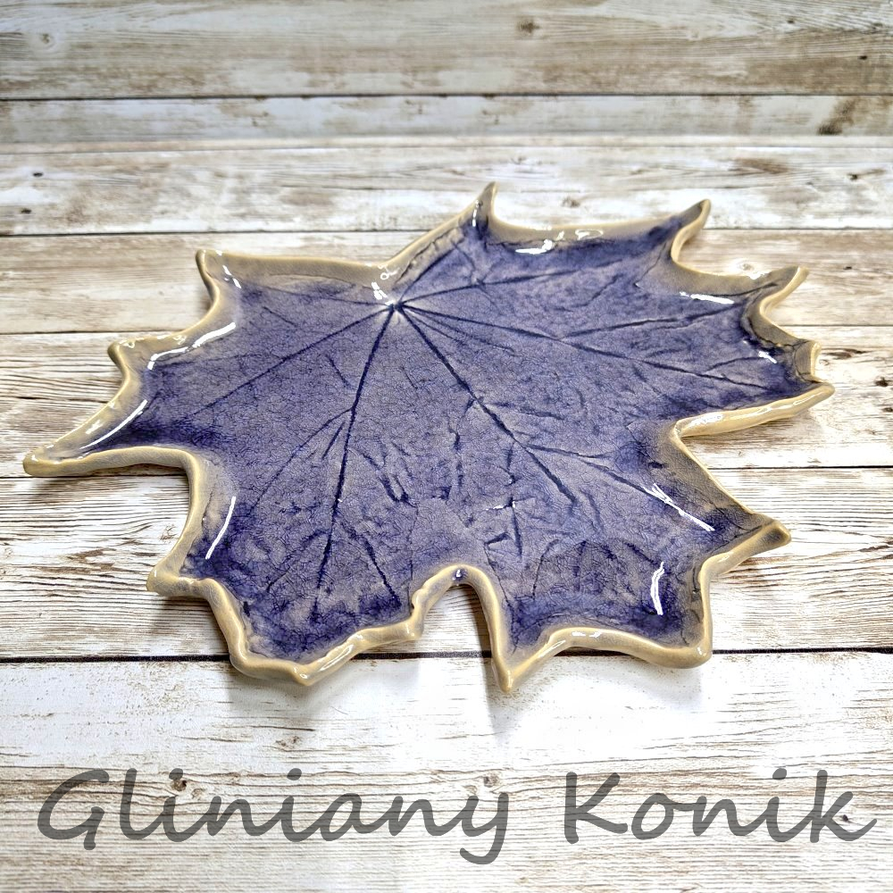 Ręcznie wykonany, fioletowy liść klonu z ceramiki o wyrazistym, dekoracyjnym charakterze. Głęboki odcień fioletu podkreśla delikatne żłobienia i strukturę liścia, dzięki czemu całość prezentuje się elegancko i niebanalnie.