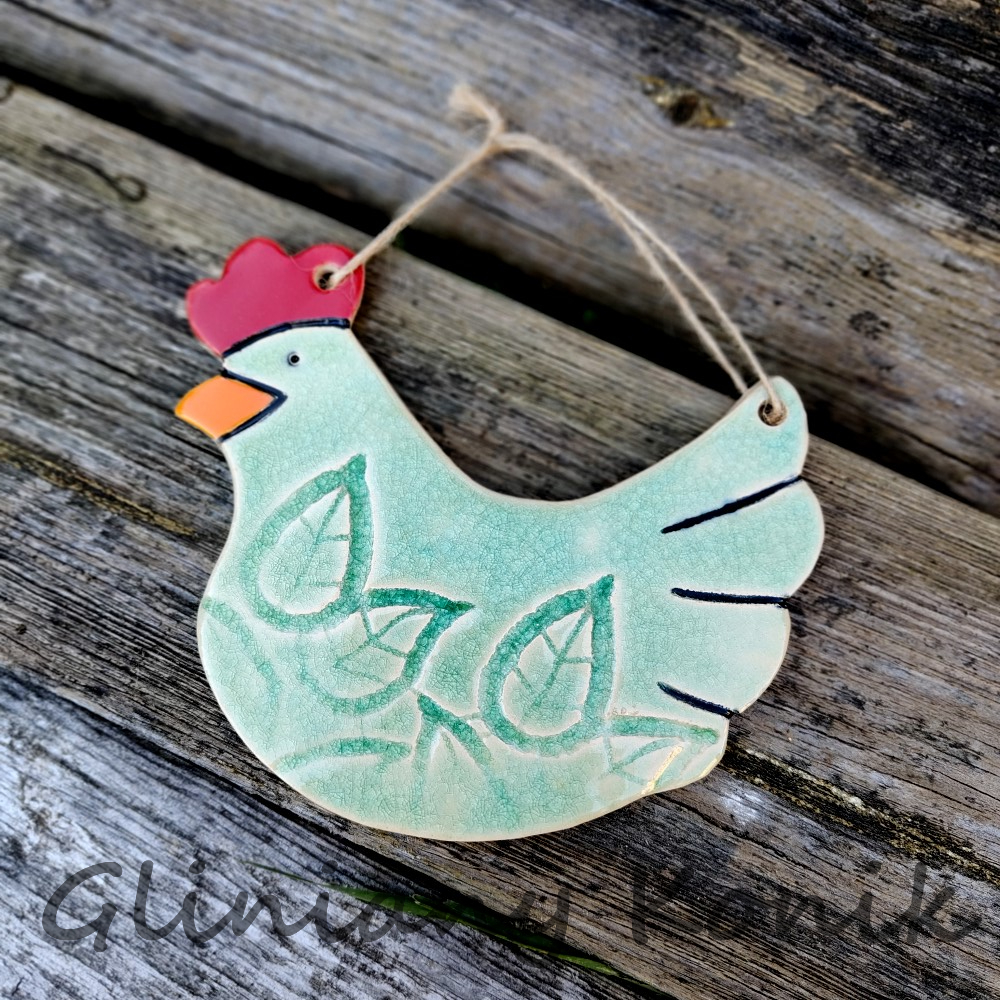 Ten seledynowy ceramiczny kogutek to mały bohater wielkich dekoracji. Ręcznie wykonany, szkliwiony na wyjątkowy kolor z połyskiem – wygląda, jakby właśnie przyleciał z artystycznej wioski, w której liczy się urok, prostota i serce włożone w każdy detal. Zawieszony w oknie, na kuchennym haczyku, gałęzi lub tarasie – delikatnie kołysze się na sznurku, wprowadzając do przestrzeni radosny, sielski nastrój. To nie tylko dekoracja – to mały akcent, który tworzy klimat. Idealny do wnętrz w stylu rustykalnym, boho, skandynawskim czy eklektycznym.