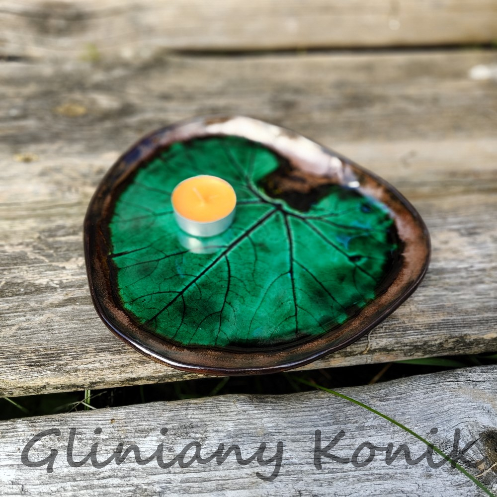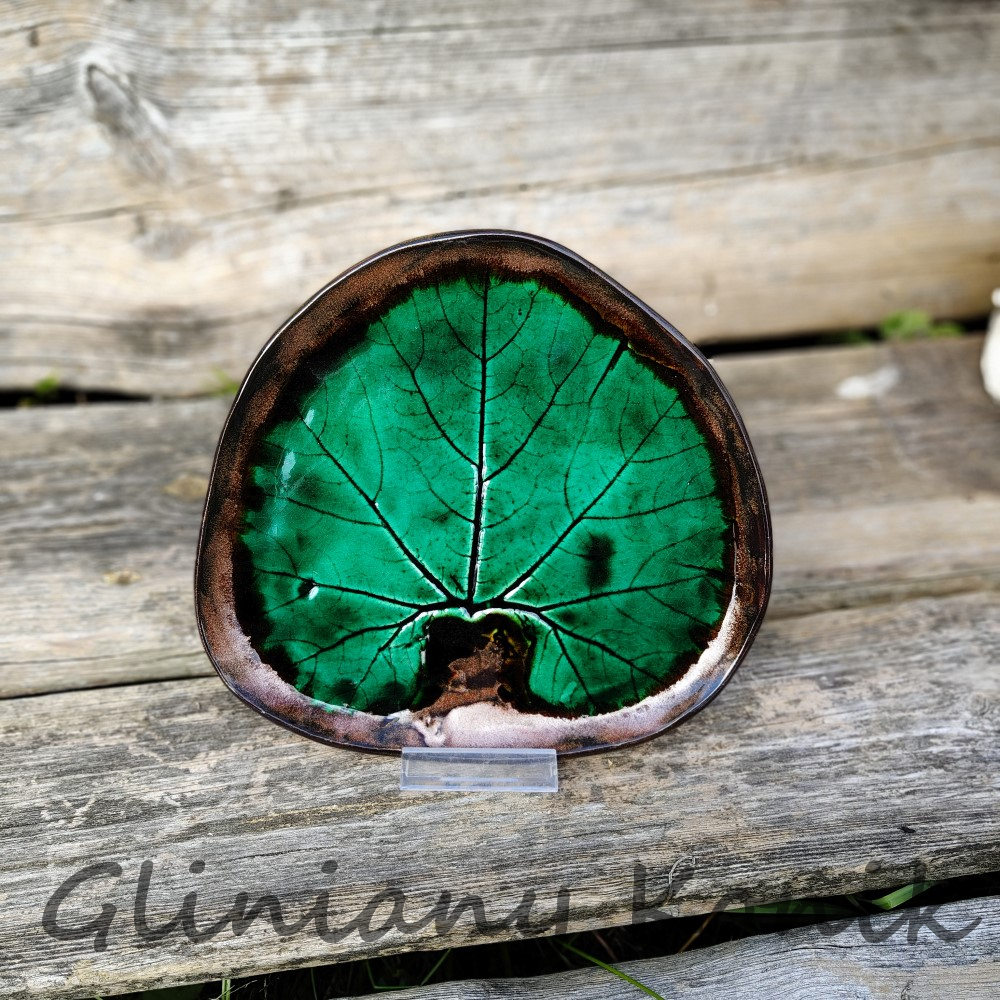 Talerz w kształcie liścia, kolor butelkowej zieleni z brązową otoczką na brzegu. Ten talerz łączy organiczny kształt liścia z elegancką, głęboką zielenią glazury. Brązowa otoczka na brzegu podkreśla naturalny charakter i dodaje mu rustykalnego uroku. Każdy egzemplarz ma subtelne, niepowtarzalne niuanse dzięki ręcznej pracy.