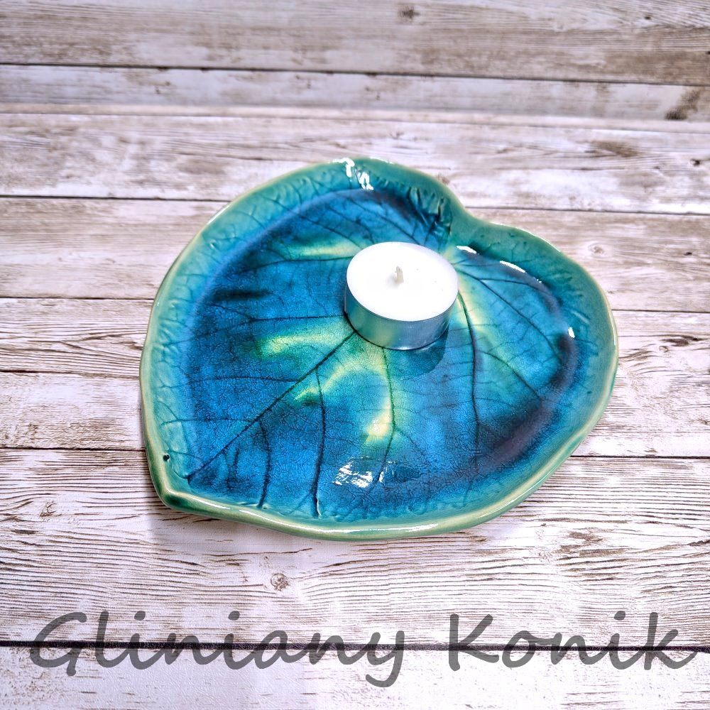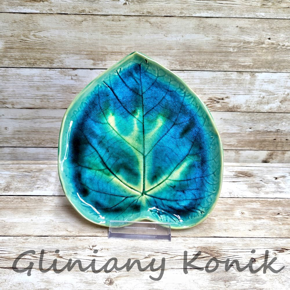 Ręcznie wykonany, turkusowy ceramiczny liść lipy o delikatnym, naturalnym kształcie. Wyrazisty odcień turkusu pięknie podkreśla charakterystyczne unerwienie liścia, tworząc efektowną, a zarazem subtelną dekorację.
