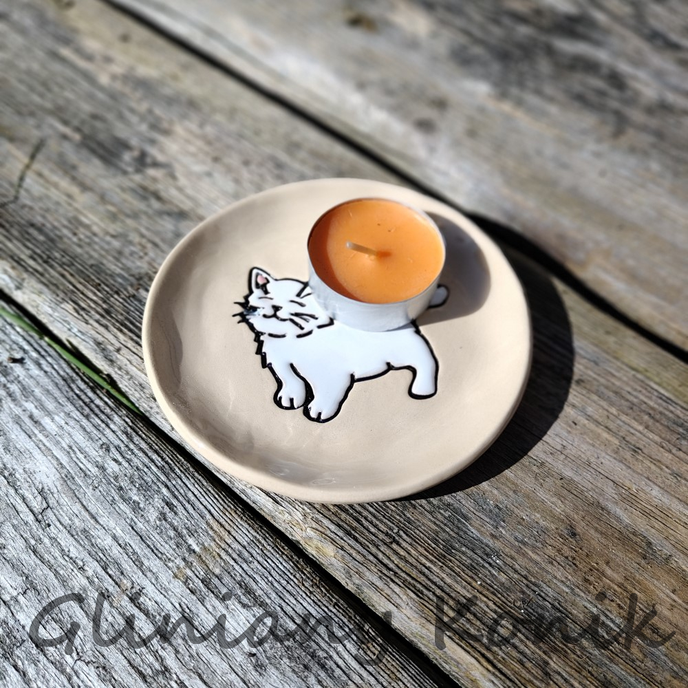 Talerzyk z rysunkiem kota białego