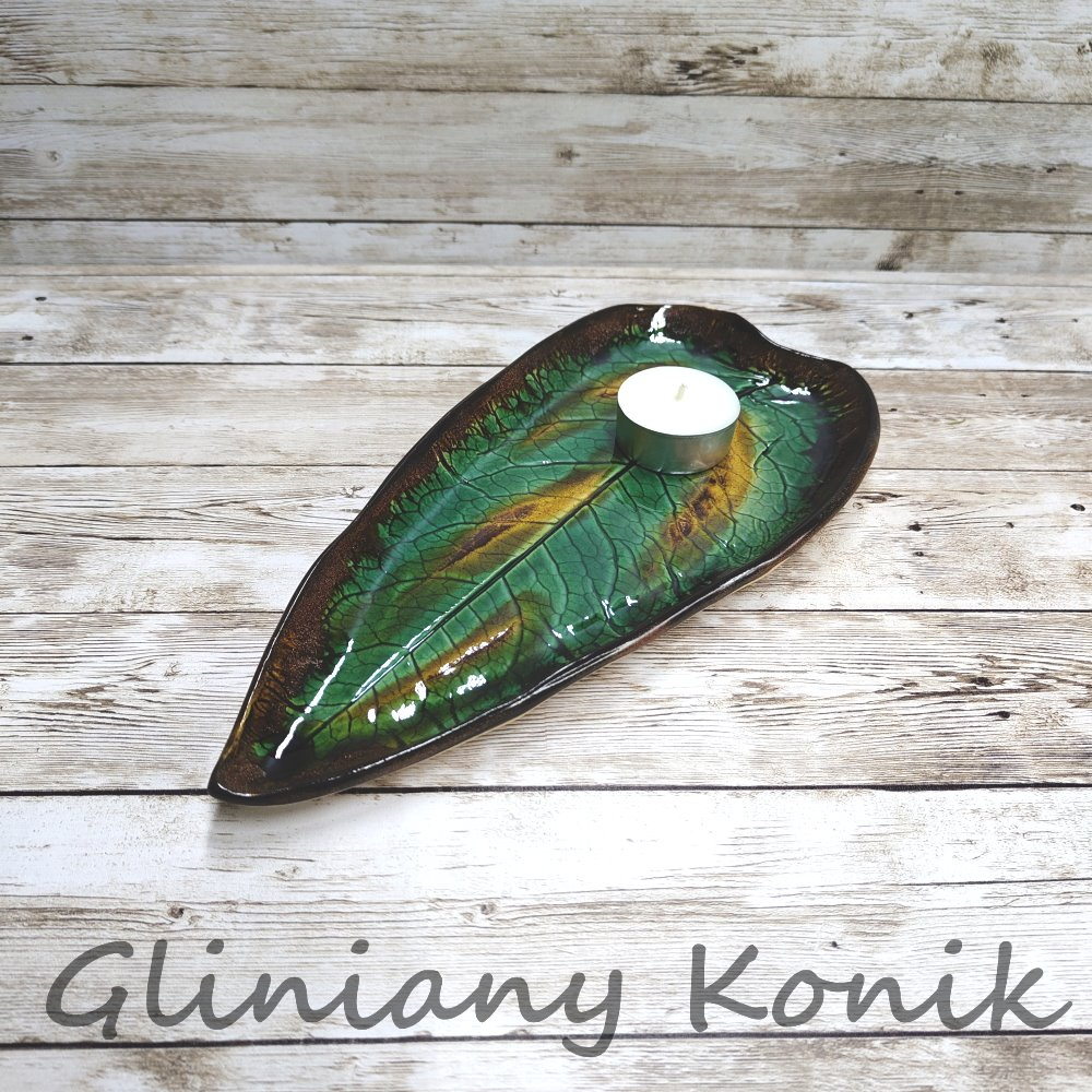 Ręcznie wykonany, trójbarwny liść ceramiczny o wyjątkowym, artystycznym charakterze. Idealny jako podstawka pod biżuterię, świeczkę, klucze lub inne drobiazgi, a także jako samodzielna dekoracja stołu, komody czy parapetu. Szkliwiona powierzchnia pięknie odbija światło, dodając wnętrzu subtelnej elegancji. Świetny pomysł na prezent dla miłośników oryginalnych, ręcznie wykonanych dodatków do domu.