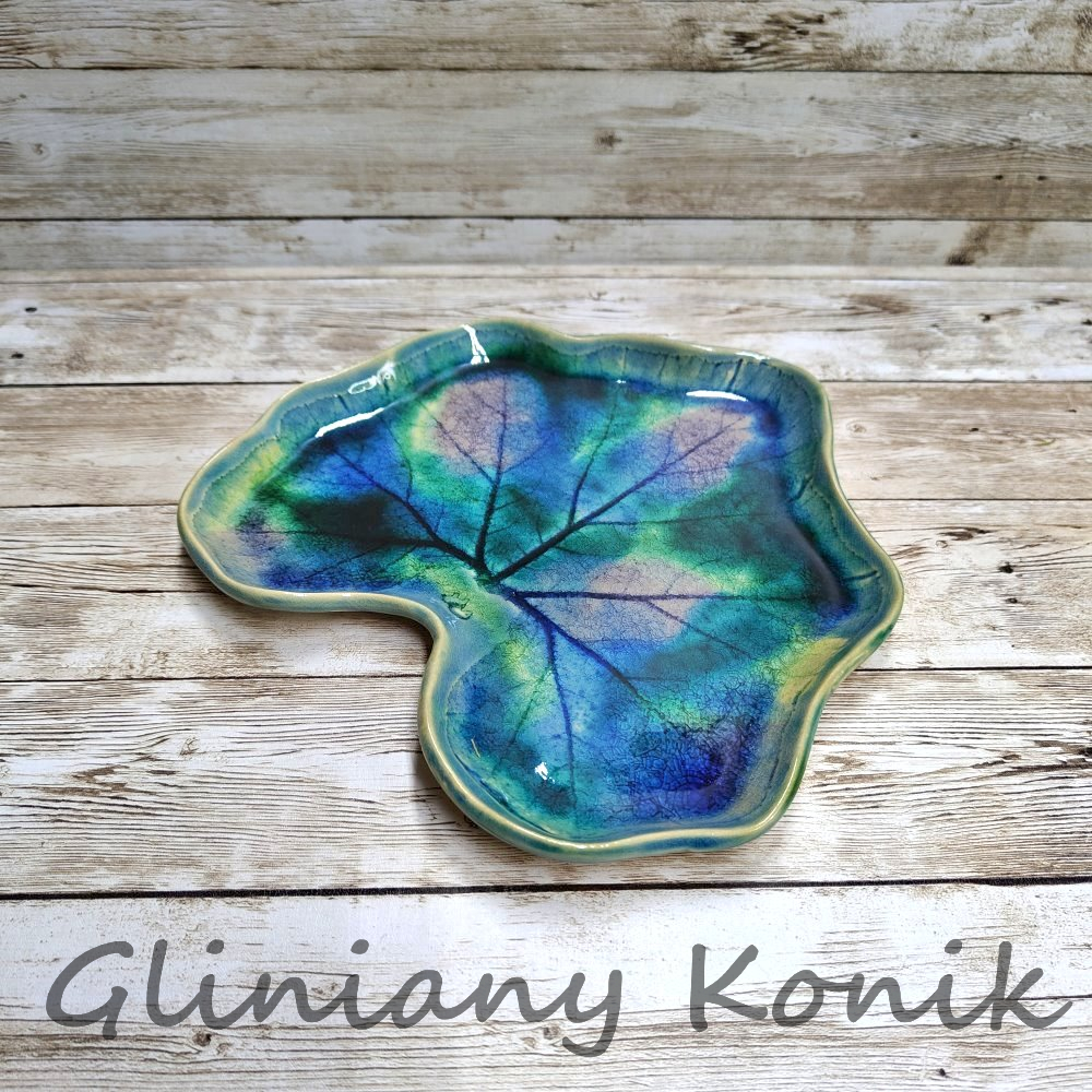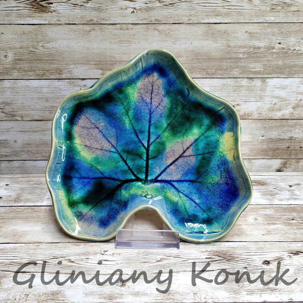 Ręcznie wykonany, wielobarwny ceramiczny liść o wyjątkowym, artystycznym charakterze. Połączenie kilku odcieni tworzy niepowtarzalny wzór. Idealny jako podstawka pod biżuterię, świeczkę, klucze lub inne drobiazgi, a także jako samodzielna dekoracja stołu, komody czy parapetu. Szkliwiona powierzchnia pięknie odbija światło, dodając wnętrzu koloru i oryginalnego akcentu. Świetny pomysł na prezent dla miłośników ręcznie robionej ceramiki.