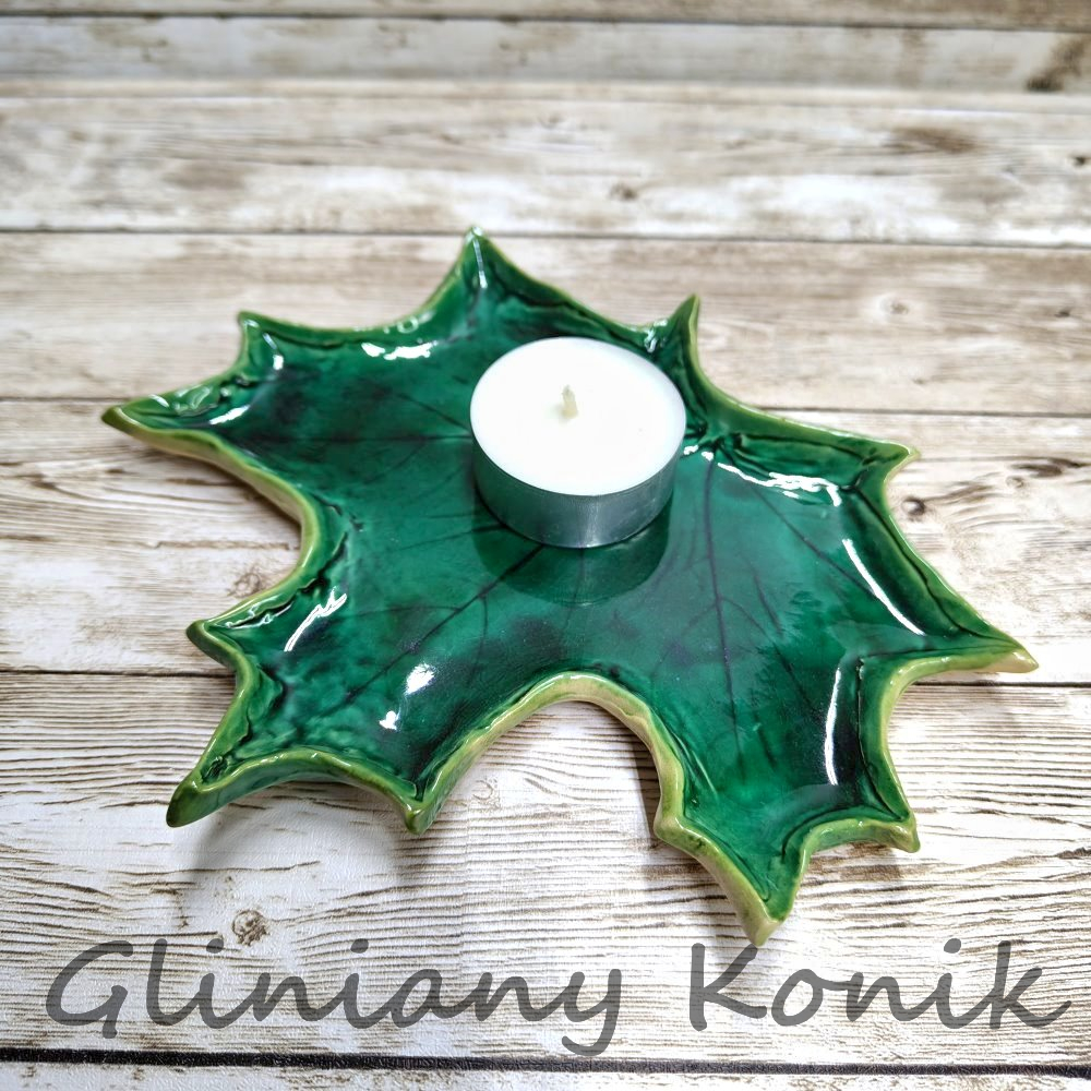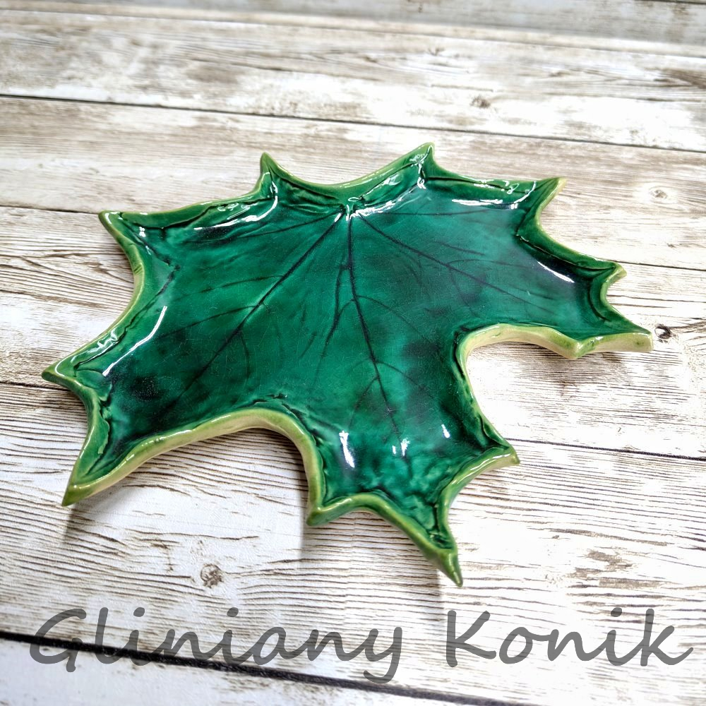 Ręcznie wykonany, zielony liść klonu z ceramiki o wyrazistym, dekoracyjnym charakterze. Głęboki odcień zieleni podkreśla delikatne żłobienia i strukturę liścia, dzięki czemu całość prezentuje się elegancko i niebanalnie.