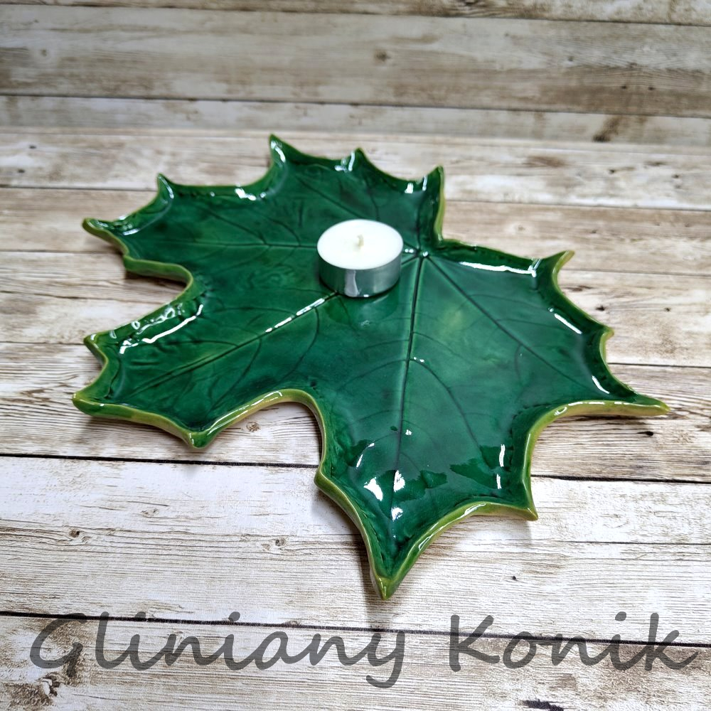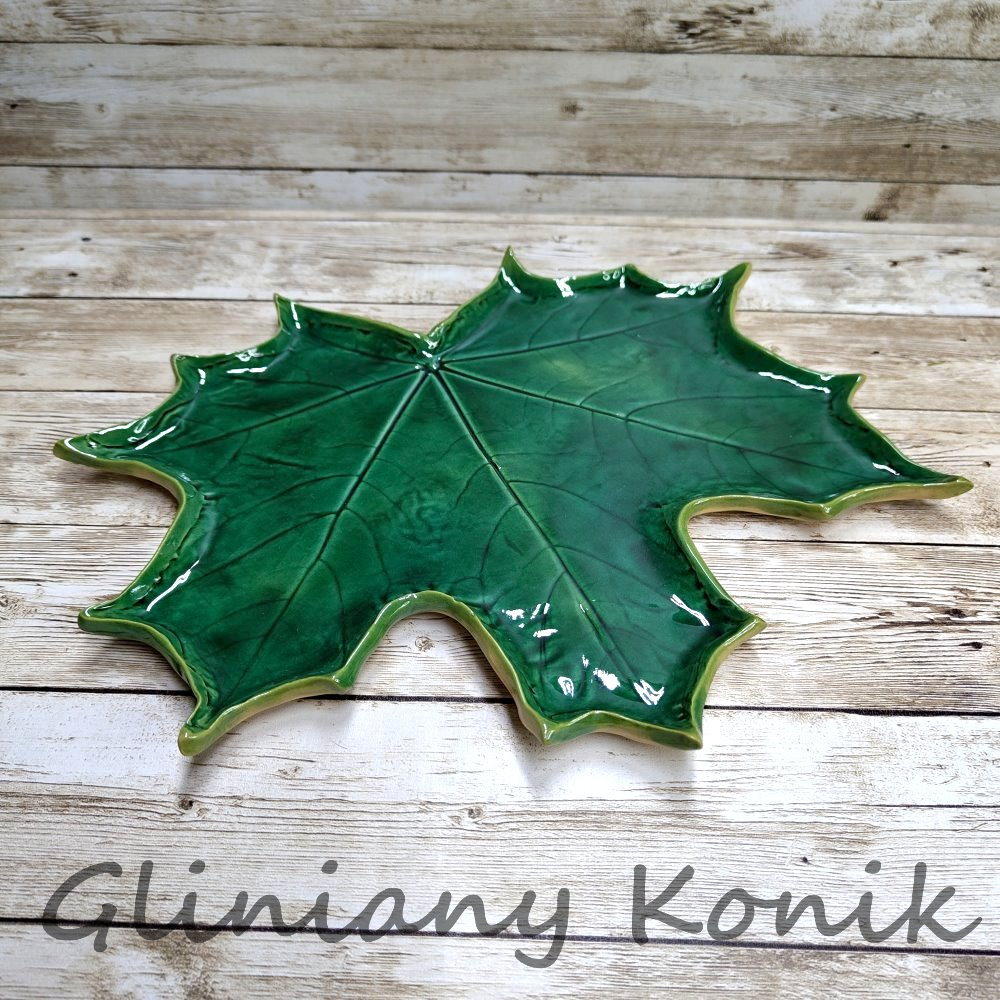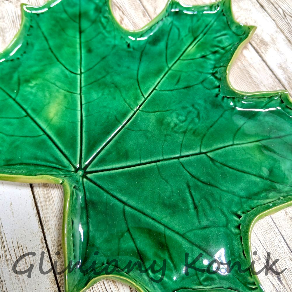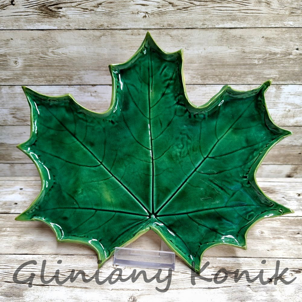 Ręcznie wykonany, zielony liść klonu z ceramiki o wyrazistym, dekoracyjnym charakterze. Głęboki odcień zieleni podkreśla delikatne żłobienia i strukturę liścia, dzięki czemu całość prezentuje się elegancko i niebanalnie.