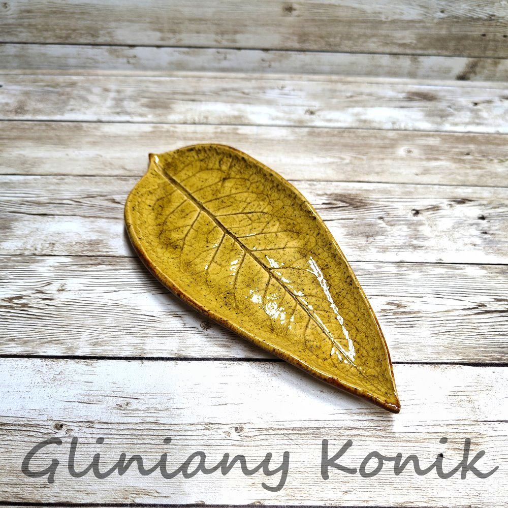 Ręcznie wykonany, złoty liść ceramiczny o eleganckim, dekoracyjnym charakterze. Pokryty lśniącą, złotą powłoką, pięknie odbija światło i przyciąga wzrok jako ozdoba stołu, komody czy półki.